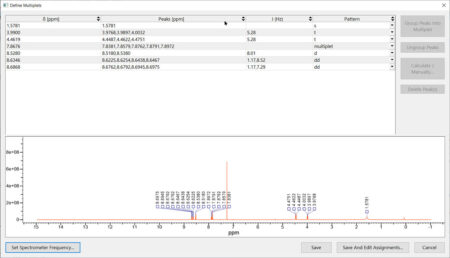 Use the Define Multiplets dialog to group peaks into multiplets, and obtain an automatic evaluation of splitting patterns, coupling constants, and chemical shifts.