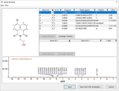 • 在MineIt中,结构分配和多任务分析对话框被分为两个不同的步骤和对话框。具有1H-NMR或13C-NMR光谱的用户可以使用“定义多峰”对话框分析多峰,然后使用“指定结构”对话框将多峰指定给化学结构。